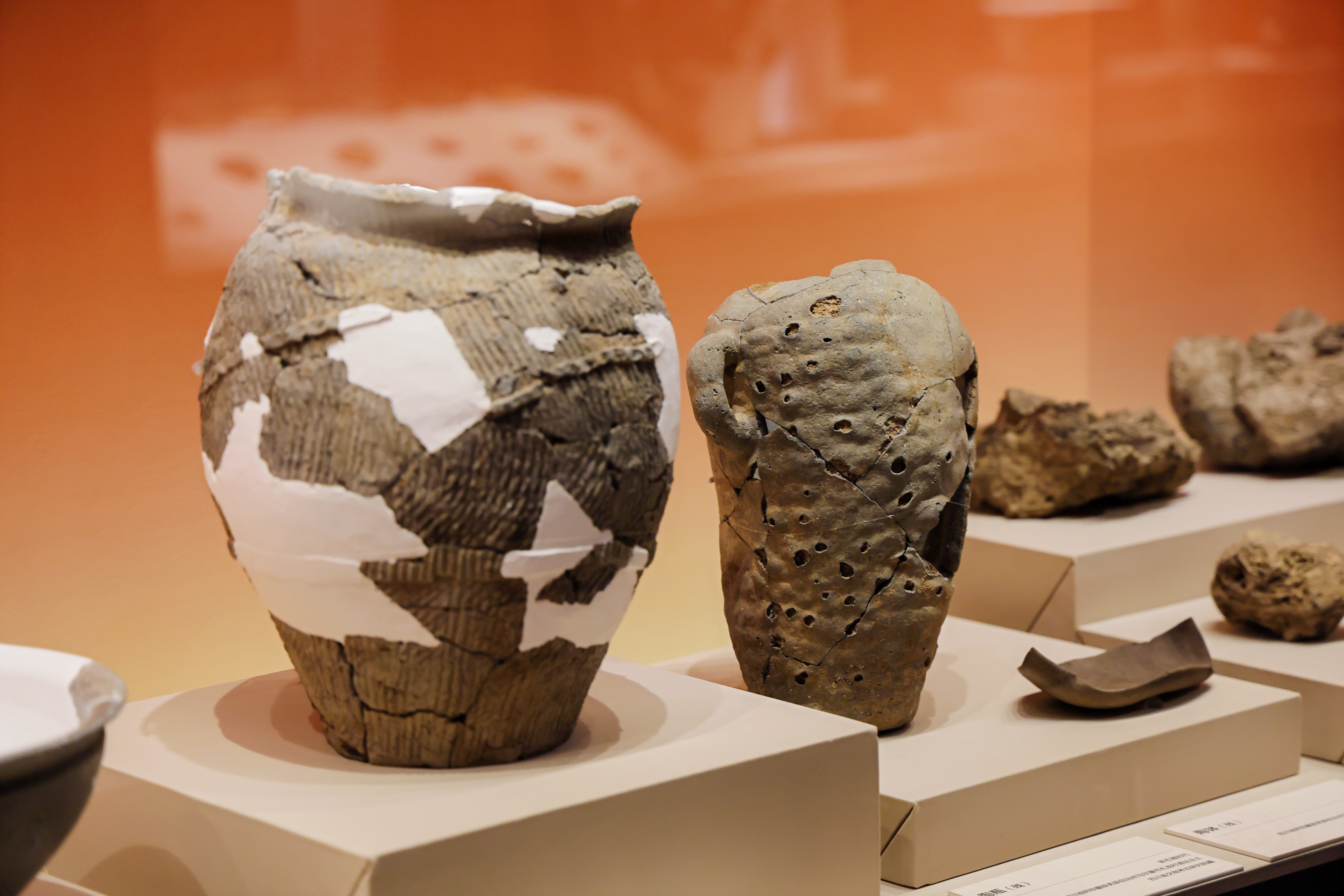 从“寻迹”,到“初识”,再到“源流”……穿梭在展览厅,三大核心篇章串联起丰富展品。其中,既有考古工具、日记等寻迹遗存,也有房址、灶、陶窑等聚落遗迹;既涵盖石斧、穿孔石刀、骨梗石刃刀等农耕狩猎工具,也包含彩陶、玉器、骨珠、陶镯等精美器物。