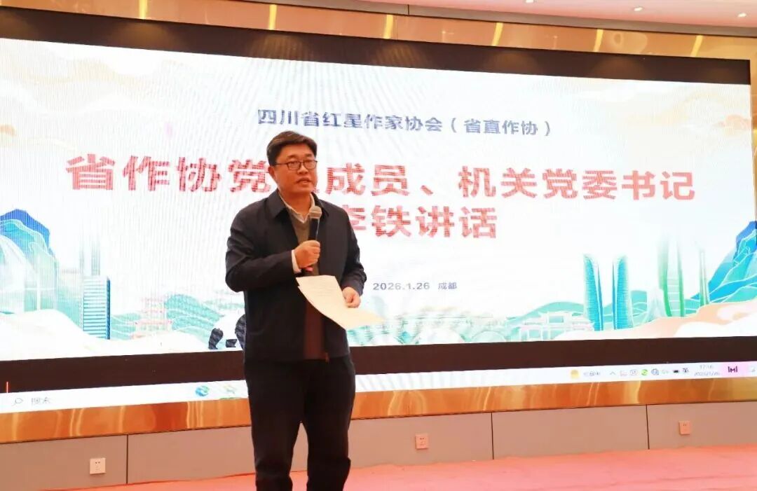 省作协党组成员,机关党委书记李铁在讲话中,首先肯定了红星(省直)作协在文学创作上的丰硕成果,并对协会对外合作,广泛参与社会生活,深入社会基层取得的探索性成果表示祝贺。他说,在赓续文学文化传统,开拓视野加强文明互鉴的时代背景下,在如火如荼的成渝地区双城经济圈建设浪潮中,我们文学工作者正面对着前所未有的机遇与广阔的舞台。他希望红星(省直)作协继续发挥好组织、联络、协调、服务的职能,进一步团结引领广大省直作家,植根巴蜀文化的深厚沃土,紧扣时代发展的强劲脉搏,在创作中始终坚持人民立场,提升作品的精神能量、文化内涵和艺术价值。期待各位作家朋友能继续沉潜心灵、精进技艺,勇于在题材、形式、风格上探索创新,用手中的笔,描绘恢宏的时代气象,书写鲜活的人民故事,创作出更多有筋骨、有温度、有深度的精品力作,共同构筑四川文学的新高峰。