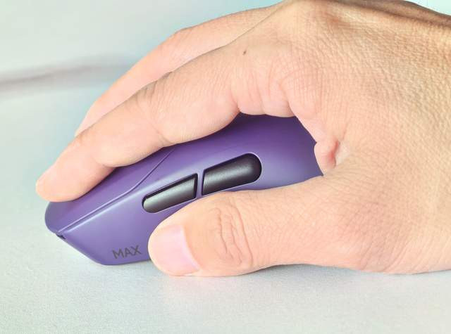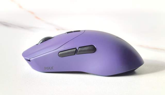 与键盘配套,我选择了电驭紫配色的VT9 MAX鼠标。鼠标体积比较小,所以在颜色方面我选择了充满电竞色彩的紫色,虽显张扬但科技感十足,外观设计是简洁大气的对称美学,通体纯紫,质感高级。125mm的长度和经典的弧线,无论是我习惯的抓握还是偶尔的趴握,掌心都能得到均匀的支撑,没有一处空悬或顶手。表面还有亲肤的防滑涂层,官方称之为“万能手感”、“抓握魔王”彰显其手感的优秀。