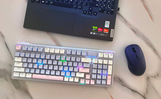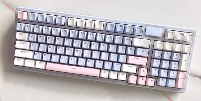 先来说说键盘,我入手的是雷柏V700DIY-98长续航版本,确实让我体验到了不一样的感觉,相比于这款键盘的丝滑和手感,传统的薄膜键盘在使用时更像有一种泥泞感。外观方面,我选择的莫奈仙踪,也就是蓝白粉的配色,既有科技感又不显张扬,搭配本人猛男的气质也不违和,反而能凸显一抹精致。紧凑的98%配列布局也是深得我心——它完整保留了数字小键盘,对于经常需要处理数据、填写表格的我来说,效率提升是立竿见影的。同时,相比全尺寸键盘,它的布局更加紧凑,整体的尺寸也小了不少,为本不宽裕的办公桌上留出了更多的空间。